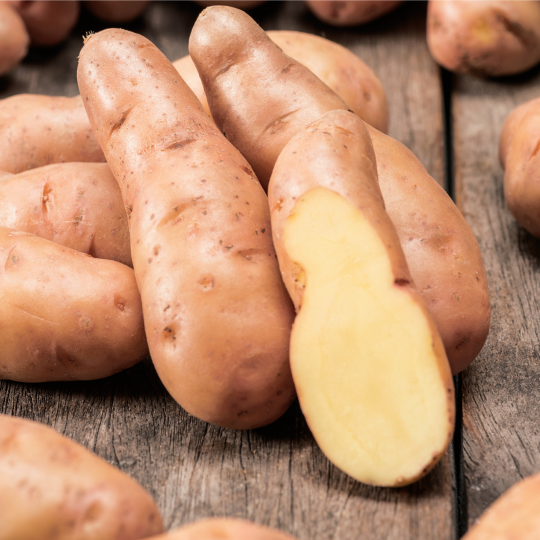 Pink Fir Apple: A very long potato with a pink blush. The firm, yellow flesh has a delicious nutty flavour. Ideal for boiling, roasting in jackets & salads.