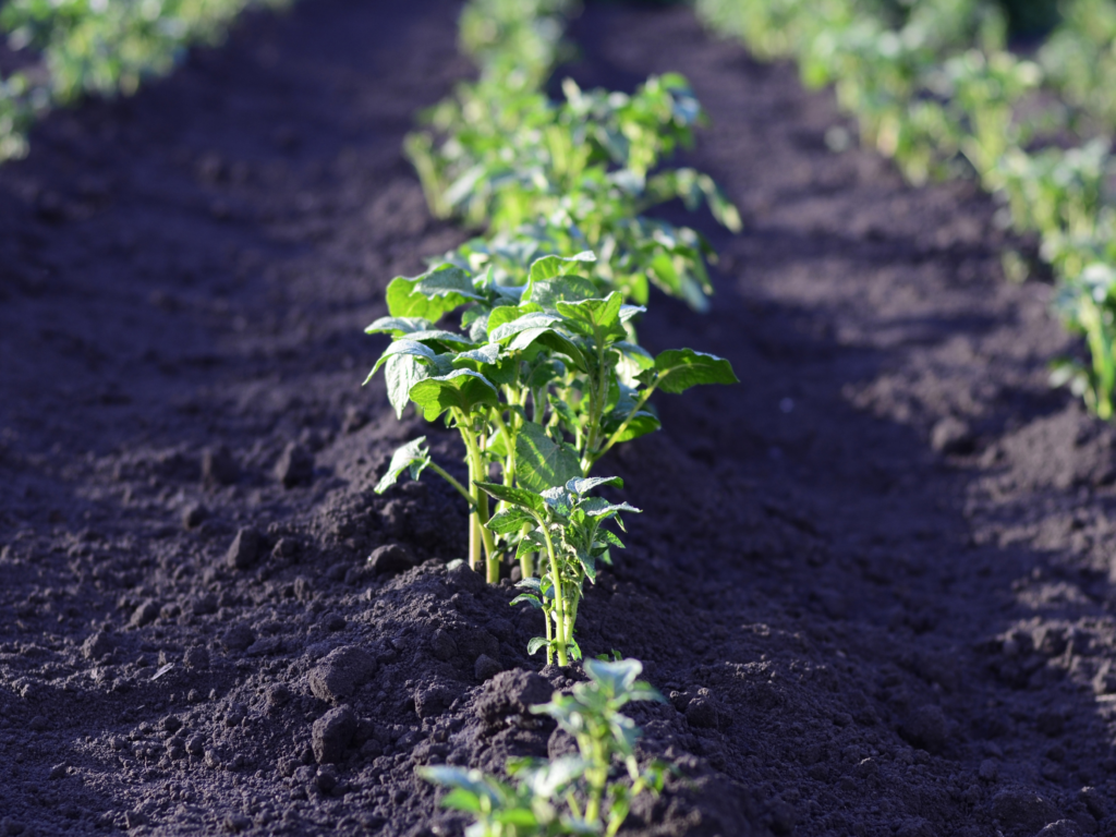 Due to the mounded structure of potato beds, sprinkler systems tend to produce a lot of run off which doesn’t easily penetrate down towards the roots. If watering by hand or with a hose, make sure to water deeply.