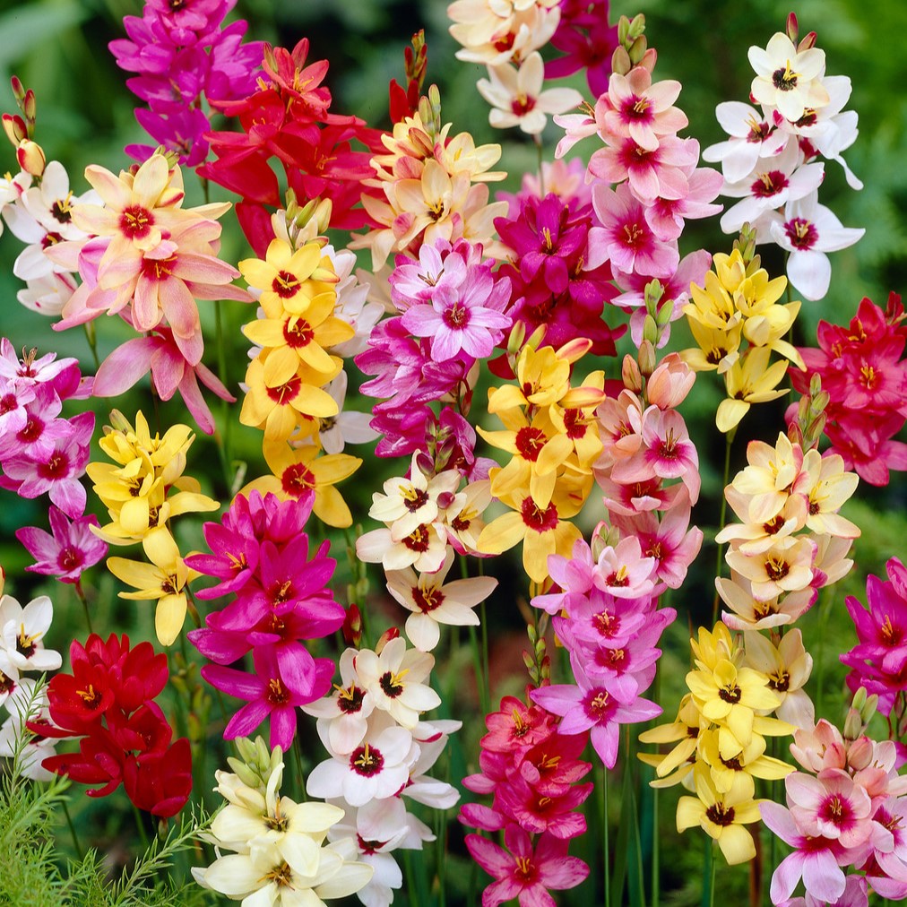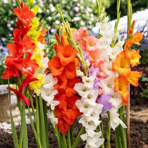 Gladioli are a later spring-flowering bulb. Great for keeping up an impressive display when earlier flowers have finished. Tall, arching sprays with up to 10 flowers per stem. The stems are strong but will perform best sheltered from harsh wind, in a sunny, well drained position. Plant in borders, rockery edges and pots.