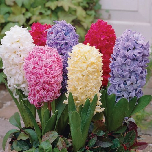 Hyacinths announce their presence with a very strong scent. Best planted in March/April in a cool spot. Grow in pots or the garden. Raise the beds if the soil is heavy or wet. Plant 8-10 cm apart, and 8-10 cm deep. Plant bulb point facing up. When flowering finishes, cut off the old flower spike (but leave the leaves on). This encourages bulb growth.